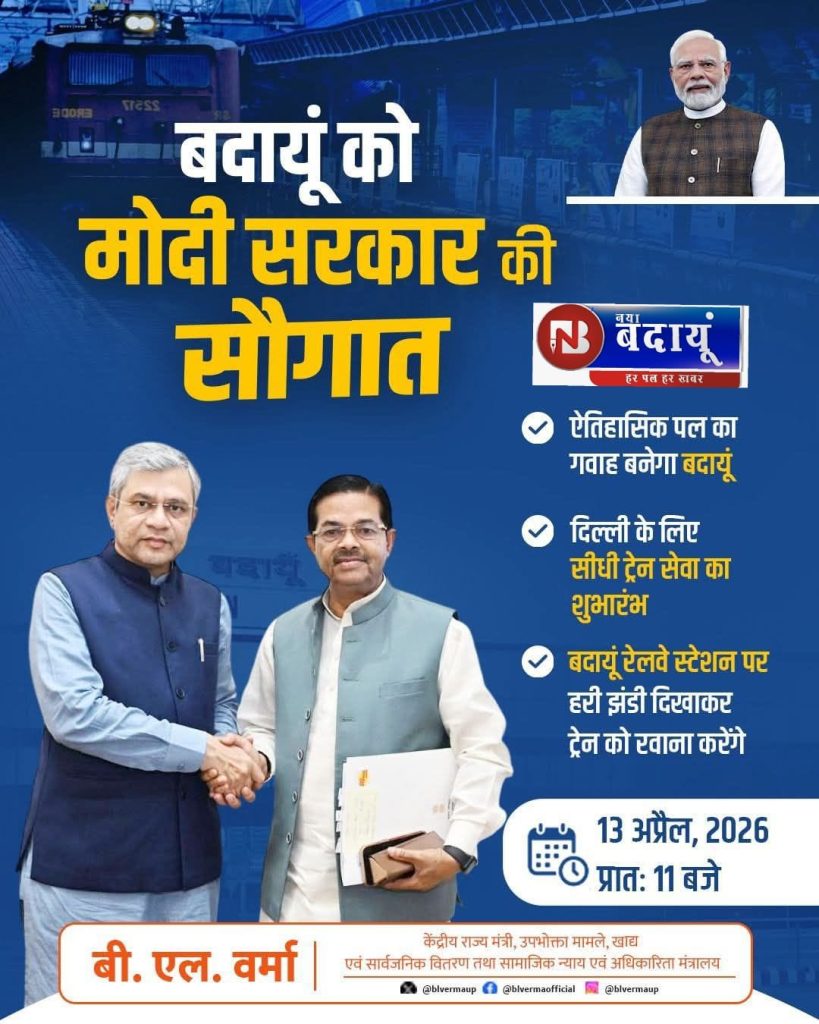 उत्तर प्रदेश के जनपद बदायूं का गठन तो 1838 ई. में हुआ लेकिन अंग्रेजी हुकुमत में केवल बरेली-मथुरा मीटरगेज रेलवे लाइन की सुविधा मिली। इसके बाद केंद्र में भाजपा की सरकार आई और 2014 के बाद बदायूं-कासगंज रेलवे मार्ग मीटरगेज से बदलकर ब्राडगेज में किया गया। इस दौरान बदायूं की जनता ने उम्मीदें कि अब बदायूं से दिल्ली के लिए ट्रेन सेवा चलेगी। मगर यह मांग और सपना वास्तव में सपना बनकर रह गया था, इसके लिए कांग्रेस से लेकर सपा के नेताओं ने काफी प्रयास किया सड़क से संसद तक मांग की। इसके बाद बदायूं के विकास के अध्याय को आगे बढ़ाने के लिए केंद्रीय मंत्री बीएल वर्मा भाजपा की केंद्र की सरकार में मंत्री बने और बदायूं से दिल्ली के लिए ट्रेन को लगातार प्रयास किया। बीते दिनों उनका प्रयास रंग लाया और सपना साकार हुआ। बदायूं से दिल्ली के लिए सीधी ट्रेन सेवा का शुभारंभ 13 अप्रैल से शुरू होने जा रहा है। केंद्रीय राज्यमंत्री बीएल वर्मा इंटरसिटी एक्सप्रेस को हरी झंडी दिखाएंगे। इस ट्रेन के संचालन से जिले के हजारों यात्रियों को राहत मिलेगी और बदायूं के विकास में एक नया अध्याय जुड़ जायेगा।