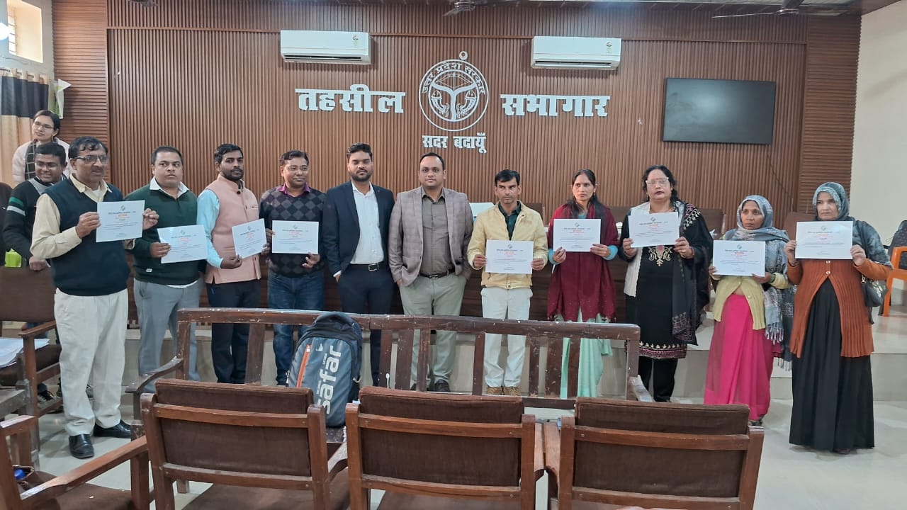 नया बदायूं। जनपद में एसआईआर का कार्य चल रहा है। शहर से देहात तक पूरा सिस्टम एसआईआर कार्य पूरा करने में लगा है। तहसील सभागार बदायूं में शुक्रवार को एसडीएम मोहित कुमार सिंह एवं तहसीलदार बीएलओ व सुरवाइजरों को शतप्रतिशत कार्य पूरा करने पर सम्मानित किया। इसमें शेखूपुर विधानसभा के बूथ संख्या 181 के बीएलओ श्रीवती, 182 पर विकास सिंह, 183 पर सीता देवी, 184 जवाबुल बेगम, 185 पर आरती यादव, 186 पर अफसर अली, 187 पर राहुल कुमार गौतम, 188 पर राजेंद्र सिंह, 189 पर ममता देवी, 190 पर तैनात बीएलओ अंजू त्रिपाठी को उनके बूथ का शत प्रतिशत कार्य करने पर प्रशस्ति पत्र देकर सम्मानित किया गया। अपने सुपरवाइजर क्षेत्र के इन सभी बीएलओ के कार्य को पूर्ण करने के लिए बृजमोहन सहायक अध्यापक सुपरवाइजर को भी प्रशस्ति पत्र देकर सम्मानित किया।